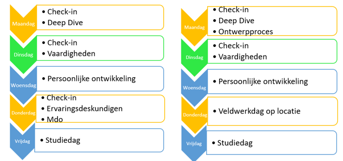 In de minor neurorevalidatie werken we met een vast weekritme. Elke dag van de week heeft zijn eigen doelstellingen en leeropbrengsten. Je bent 4 halve dagen op de HvA en 1 dag per week is bedoeld voor studie en uitwerking van opdrachten en dossiers. In deel II ben je ook 1 dag per week bij een zorgorganisatie.