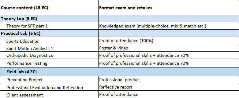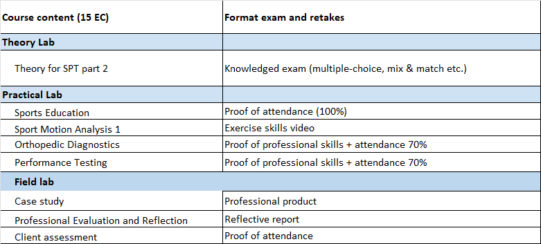 In the second part, we apply knowledge from the first part in practical situations. Please note we focus on the individual athlete and use a more qualitative case-based approach, you will learn to apply sports (injury) diagnostics from the first module to rehabilitation goals and trajectories, both on a physical and psychological level. Just like the first part, in the second part practical classes are also supported by a wide range of theory lessons such as Advanced Exercise Physiology, Sport & Performance Psychology and the role of Sport Nutrition for performance and recovery. You also learn to "zoom out" from individual level to what you can do for a sports club by collecting and analyzing performance data at the group level. Field assignments will support your development as a critical and more scholarly professional (e.g. the practitioner-scientist).